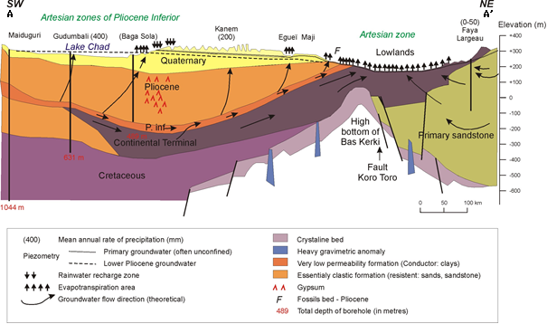 Most of the Lake Chad basin is covered by Quaternary sands. Below the sands, at about 75 m depth, appear the clays of the Pliocene with a mean thickness of approximately 280 m. Further down, a layer of sand of about 30 m thickness is encountered that belong to the Lower Pliocene. These sands give place to the real Pliocene aquifer, as the clays are generally considered as impermeable. Further down appear the sandstones of the Continental Terminal (Tertiary) with a thickness of about 150 m. The deepest aquifer is the Continental Hamadien (Cretaceous), which also consists of sandstone. The granitic and gneiss rocks of the basement at the bottom are considered as the base of the system. Given its geological characteristics, the Lake Chad basin has considerable groundwater resources. Effective infiltration varies between 5 mm around the 15th parallel and 100 mm around the 10th parallel. Groundwater exploitation was estimated at 438 million m3 in the early 1990s in the Conventional Basin. This level of exploitation is insignificant in relation to available reserves.